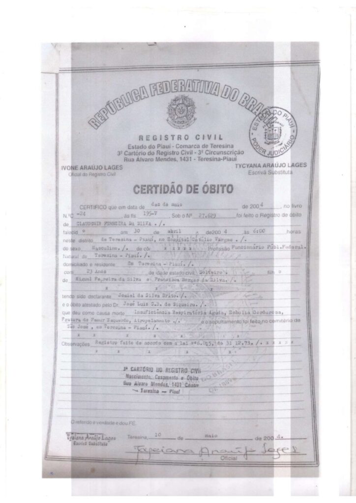 Quero concluir esse lembrete apresentando abaixo o atestado de óbito de um deficiente físico de prenome Claudemir, um dos fundadores da Associação dos Deficientes Físicos de Teresina (ADEFT), que foi vítima de atropelamento sobre a faixa de pedestre por um irresponsável, mas pertencente a elite da corja desse estado, permanece impune até a presente data. A pouco tempo em conversa com o Mauro, lhe perguntei: Como ficou o inquérito da morte do Claudemir? A resposta foi rápida, incisiva e curta “foi arquivado”.